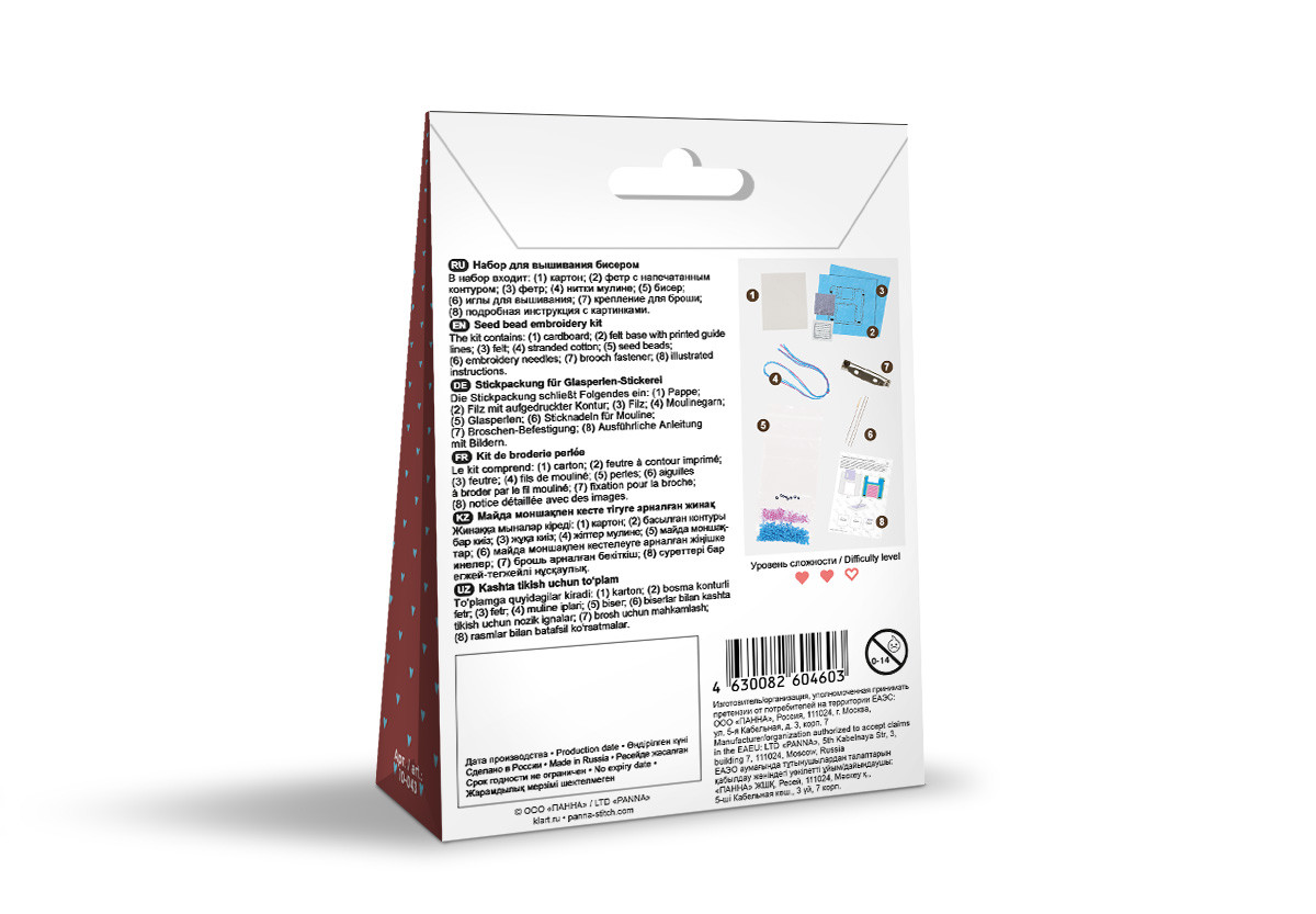 В набор для вышивания Klart входит: фетр с нанесенным контуром, фетр для оформления оборотной стороны броши, картон, бисер, хлопчатобумажные нитки мулине Gamma, тонкая игла для вышивания бисером Gamma, крепление для броши, подробная инструкция с цветными иллюстрациями. Сообщить о неточности в описании