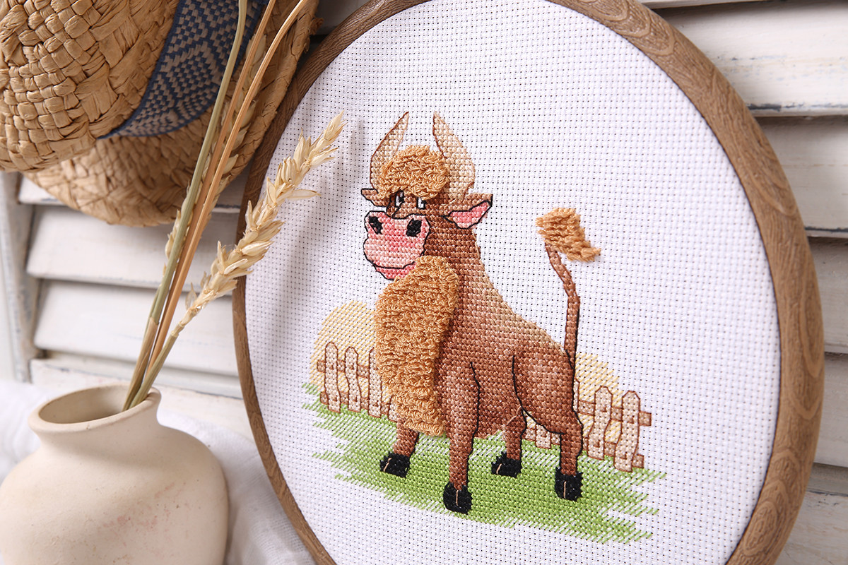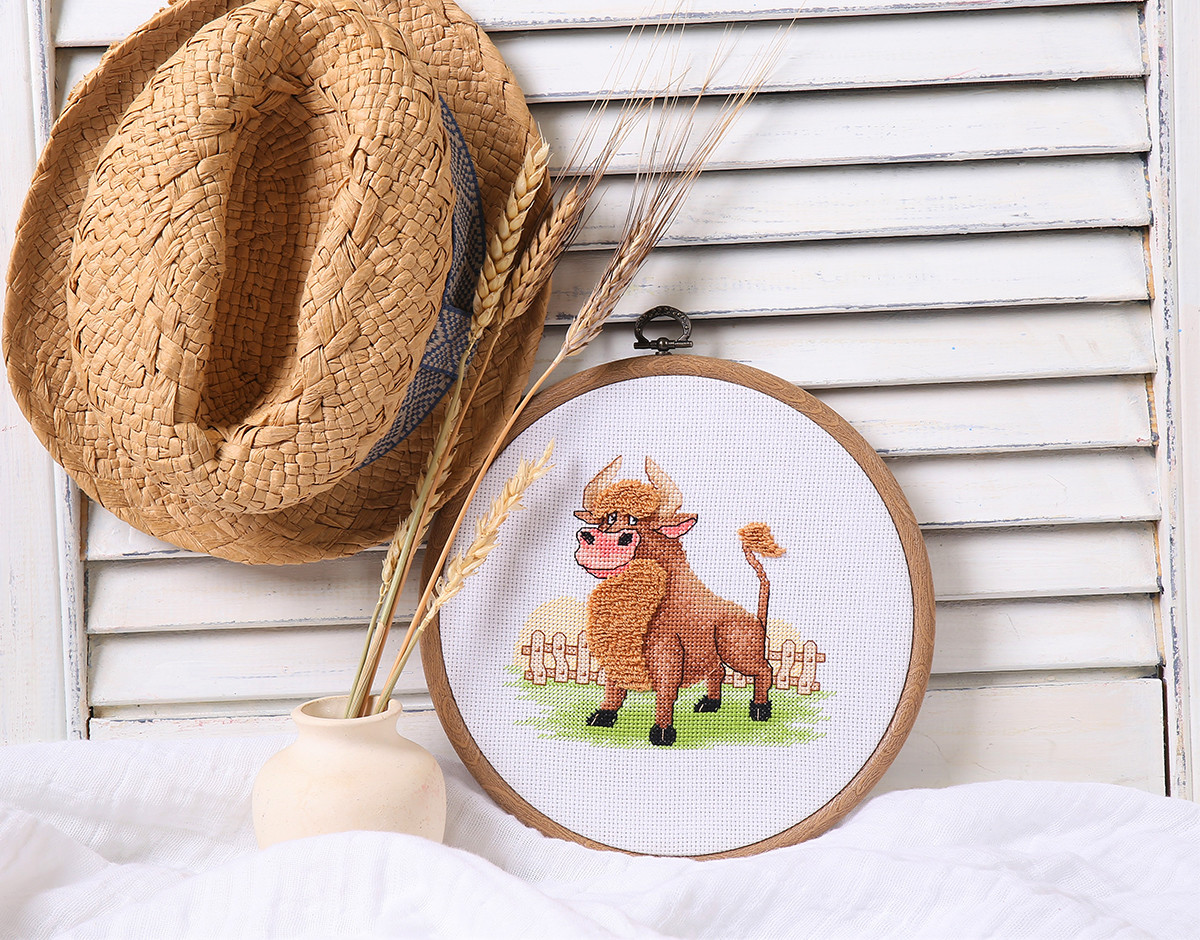 В набор для вышивания " Klart" входит: аппретированная канва Gamma, хлопчатобумажные нитки мулине " Gamma", игла для вышивания " Gamma", палочка для выполнения бархатного шва, схема и подробная инструкция по вышиванию. Бык – символ стойкости, силы и мужского начала.