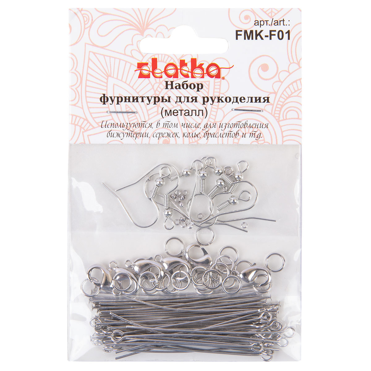 Набор фурнитуры " Zlatka" FMK- F01 для создания бижутерии. Содержит в себе всю необходимые детали для создания готового украшения: кольца диаметром 4 мм; замки размером 12х7 мм; швензы размером 18х20 мм; кримпы диаметром 1, 5 мм; штифты " гвоздик" размером 50 мм; штифты с петлей размером 50 мм. Состав: латунь. Не содержит никель и свинец. Сообщить о неточности в описании